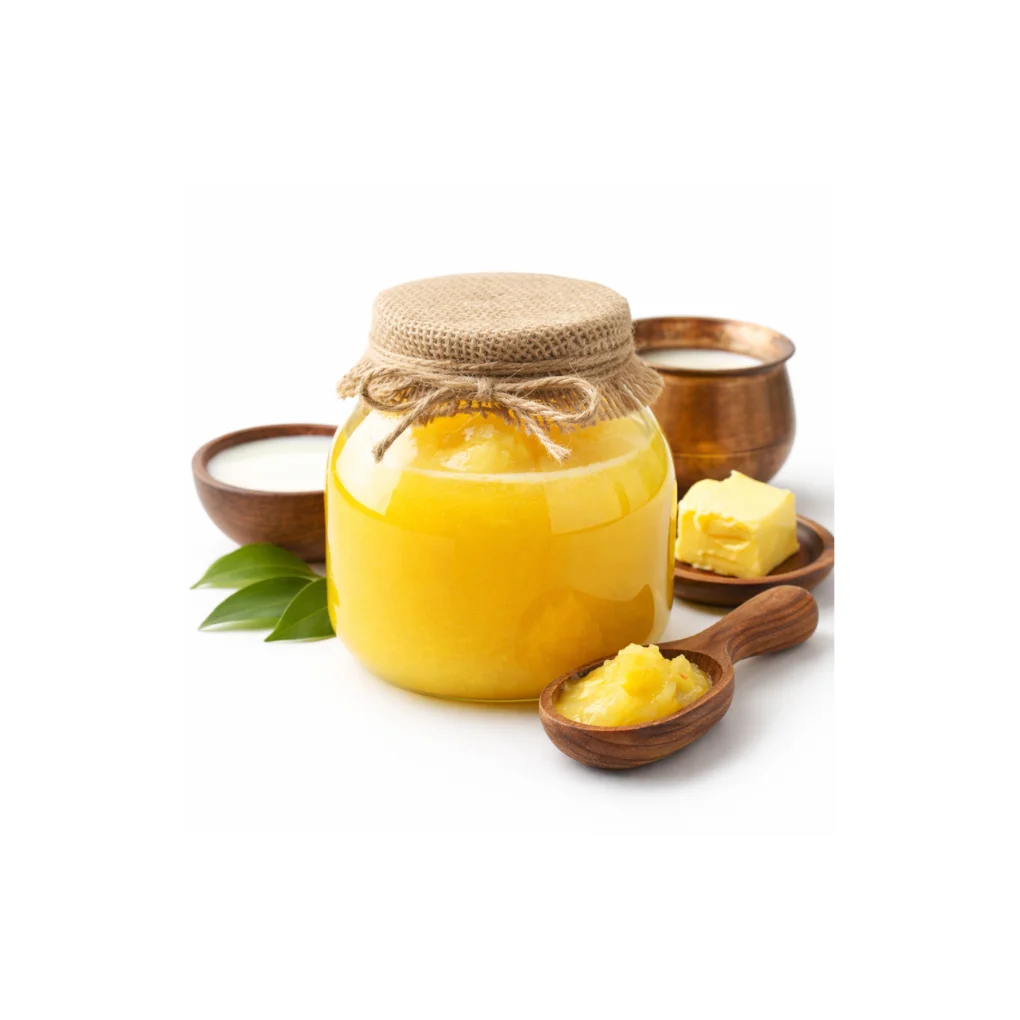 High-quality butter is heated slowly until it melts and the milk solids separate. The butter is simmered until it becomes golden and fragrant. The clear liquid fat is filtered to remove residues and stored in airtight containers. This gentle process ensures pure, flavorful ghee with long shelf life and rich nutrition.