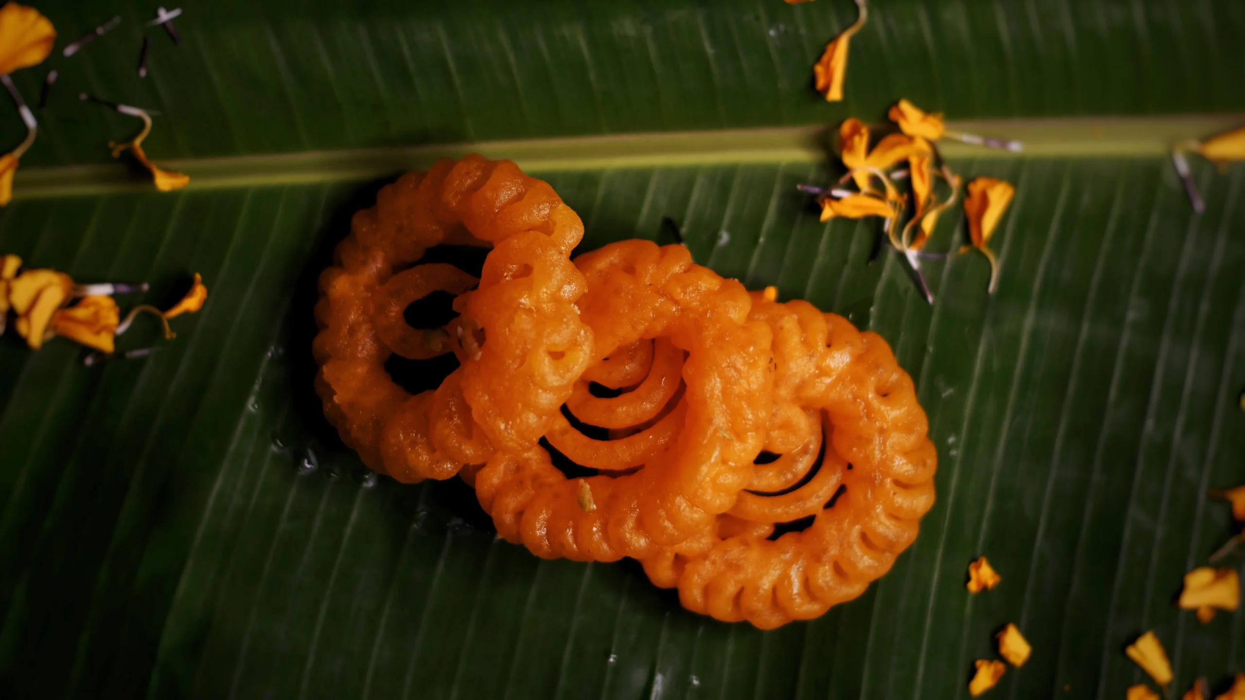 Jangiri is prepared by soaking urad dal, grinding it into a smooth batter, and piping it into hot oil in circular floral shapes.Once crispy and cooked, the hot Jangiri is immediately soaked in fragrant sugar syrup flavoured with cardamom and saffron.This helps the sweet absorb the syrup fully, giving it a juicy and melt-in-mouth texture.