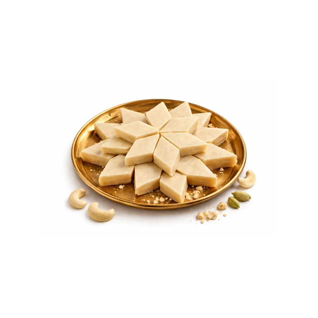 A premium cashew sweet with a smooth, melt-in-mouth texture made using ground cashews and sugar.